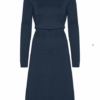 Kjolen er strikket i 100% økologisk bomuld, der virker let og blødt, og det giver et virkelig fint fald i stoffet. Kjolen findes i tre forskellige farver. To med grafisk mønster og denne i en flot navy-blå farve.