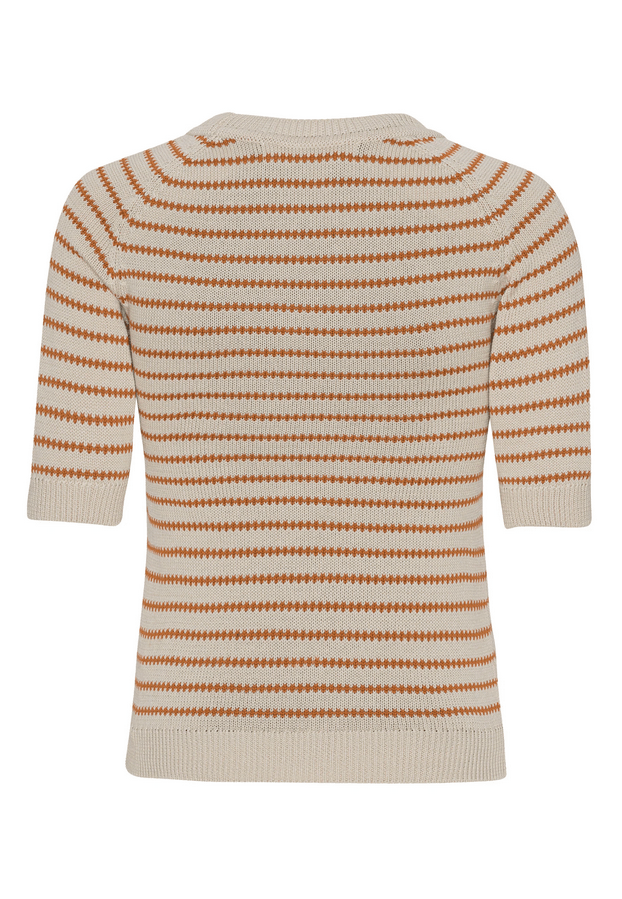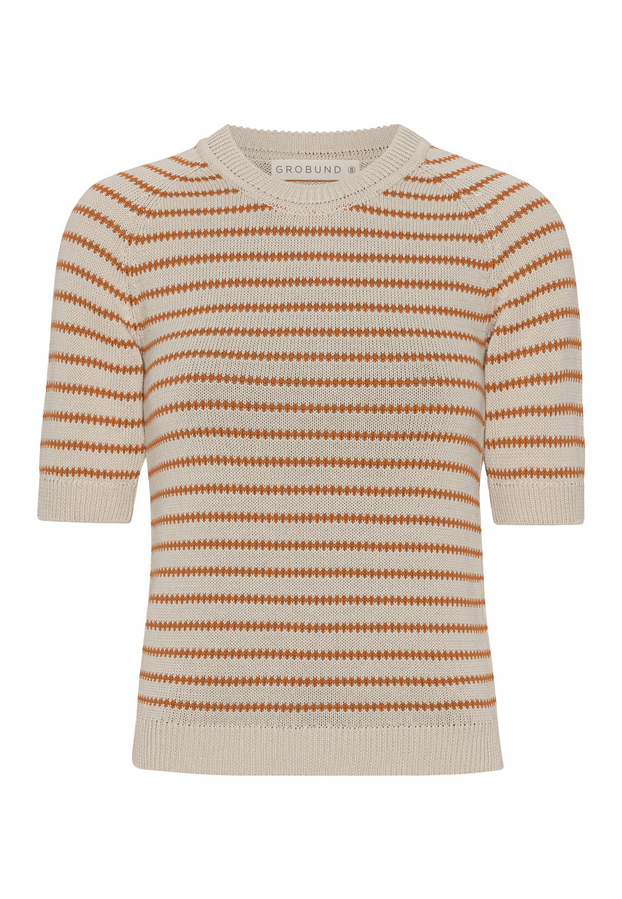 Kig på denne skønne t-shirt fra GROBUND. Ida strik tee er den perfekte kombination af behagelig og enkel stil. Den cremehvide farve med de karamelfarvede striber giver den et afslappet, men stadig pænt udseende.
