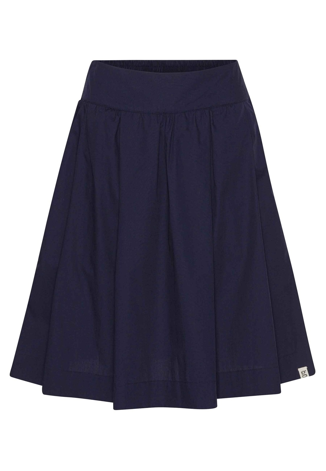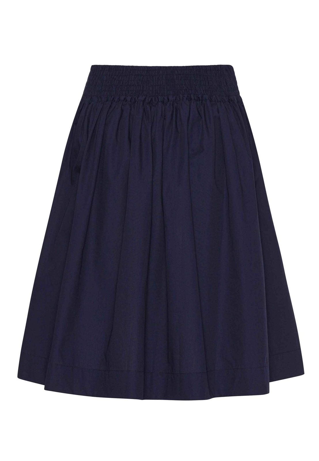 Nederdelen er syet i økologisk vævet bomuld – poplin – som virker let og crispy, og det giver et virkelig flot fald i stoffet og et elegant udtryk til nederdelen. Den midnatsblå farve er en helt dyb mørkeblå, der gør nederdelen klassisk og nem at bruge.