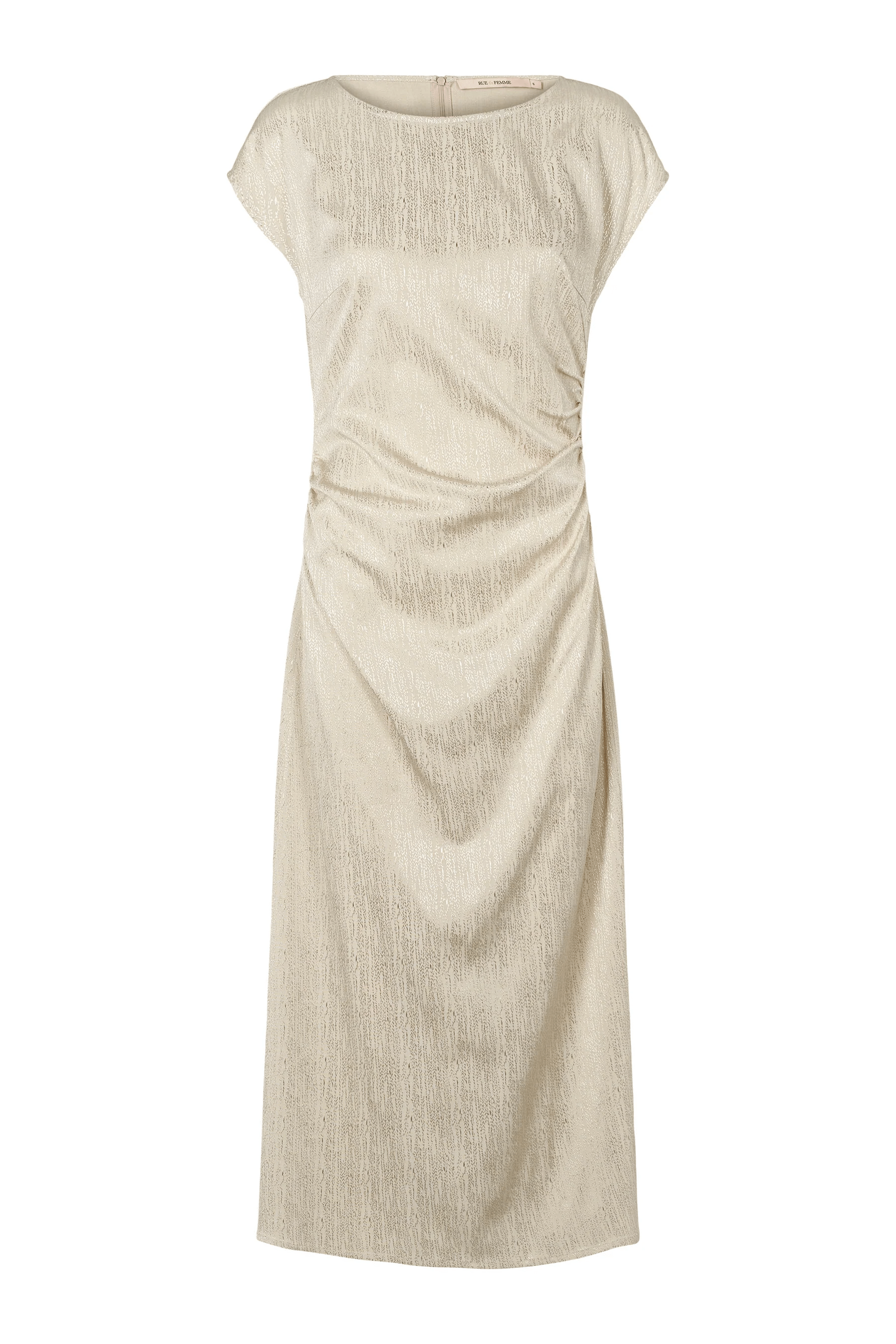 7337RDFGalentea er en tætsiddende kjole med korte ærmer, draperet effekt i siden og diskret slids bagpå. Elegant og flatterende silhuet.