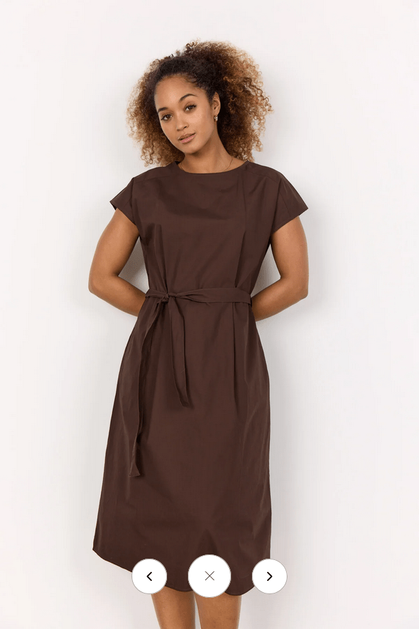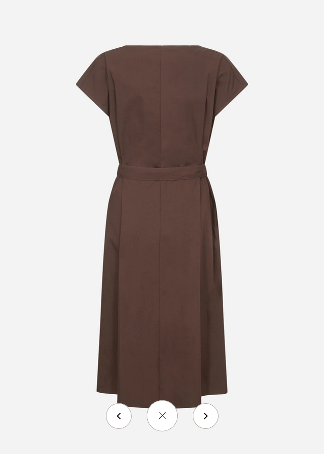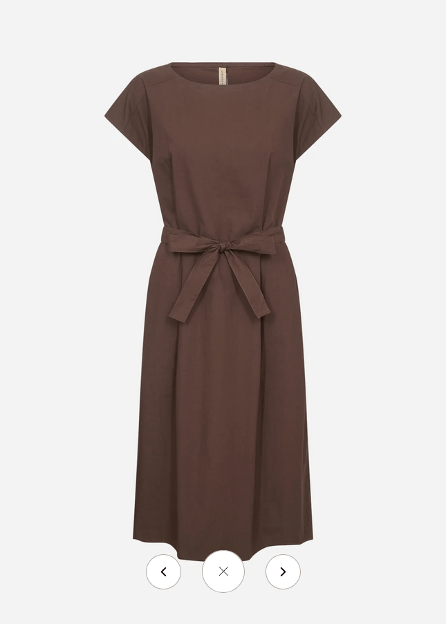 SC-RACHELLE 5 er en mellemlang kjole fremstillet af 100 % økologisk bomuld. Den har en tætsiddende overdel med bådudskæring, korte ærmer og bindebånd i taljen; en skjult lynlås sikrer ryggen, og nederdelen blusser let ud forneden. Brug kjolen med flade sandaler til en dag i byen eller med høje hæle til et afslappet aftenarrangement.