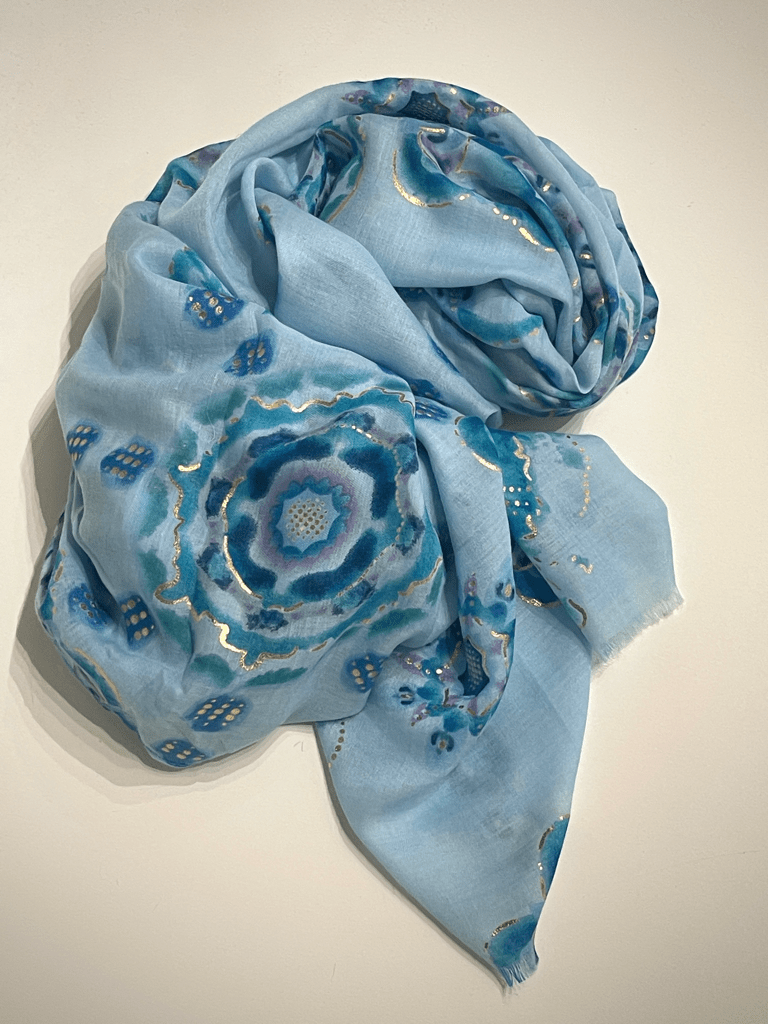 Blødt langt tørklæde fra ThreeM i skønne blå aqua farver med lidt guld i. 50%Bomuld 50%Viskose